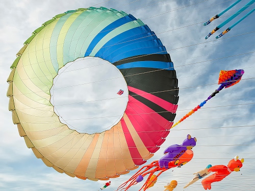 Tag: aquiloni, cielo, colori, nuvole, azzurro, rosso, volare, cerchio, viola, fili, vento, code, pupazzi, arancione.