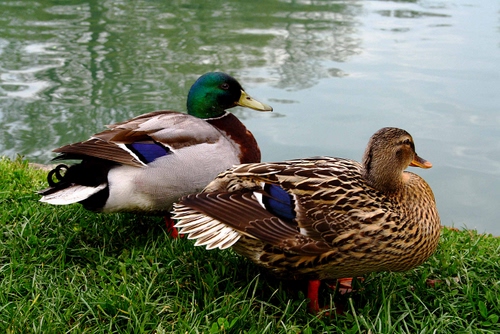 Tag: erba, piume, acqua, verde, anatre, becco, prato, colori, due, uccelli, riflessi, fiume, germani, coppia, becchi, femmina, ali, maschio, lago, animali.