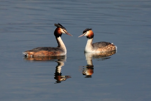 Coppia di Svasso maggiore (Podiceps cristatus) nella stagione degli amori. A sinistra il maschio, a destra la femmina. In realtà il dimorfismo sessuale in questa specie non è così evidente, ma in questa stagione il maschio alza la cresta per "fare colpo" sulle "donzelle" e mostra un comportamento tipico che lo rende riconoscibile.