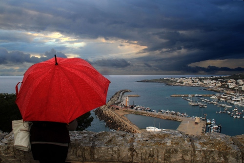 Tag: rosso, ombrello, porto, mare, panorama, nuvole, barche.