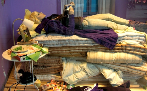 Tag: materassi, manichino, tavolino, telefono, libro, letto, comodino, lampada, piselli.
