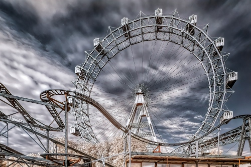 Bella, il contrasto con il cielo nuvoloso mette ancora più in risalto la ruota e l'ottovolante che sembrano un tutt'uno. |