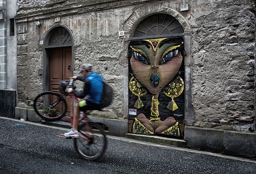 Bella contrapposizione fra il mosso e il portone fermo... quasi come se assistesse...