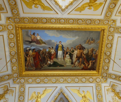 Reggia di Caserta sala di Astrea. Il dipinto raffigura Astrea, la dea della Giustizia, al centro con un manto blu mentre scaccia la Prepotenza, l'Ignoranza e l'Errore.