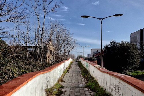 Altri tag (senza riscontro): stradina, camminata, marciapiede, cespugli, balaustre, secchi, siepi, foglie, bianco, hinterland, bordi, fuga, prospettiva, scorcio, palazzi, pista, abbandono, pedonale, passeggiata, mattonelle, fuoricittà, arancione, vialetto, sobborgo, spogli, muri, viottolo, finestre, incolto, cemento.