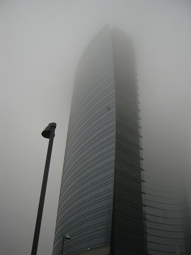 La Torre Unicredit, a Milano, in una giornata grigia e nebbiosa.