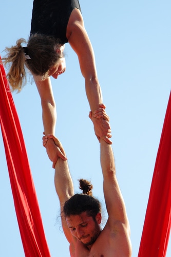 Altri tag (senza riscontro): copia, teli, circo, ragazzi, atleti, esercizio, cielo, forza, ballerini, equilibristi, rossi, presa, esibizione.