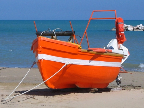 Tag: barca, mare, spiaggia, arancione, arancio, remi, salvagente, bianco, sabbia.
