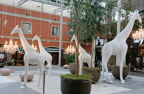 4 giraffe bianche in un centro commerciale