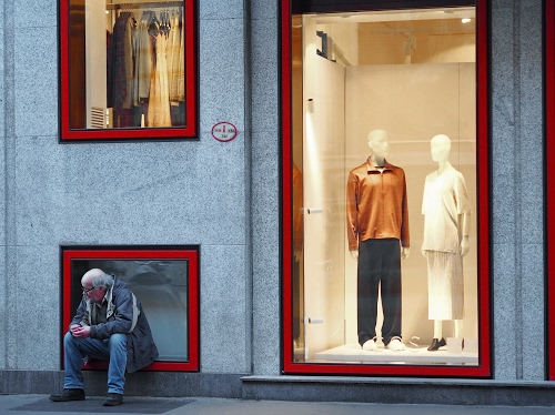 Si è una street bisogna cogliere l'attimo scenico dove ci si trova, non sempre si riesce a centrarle perfettamente, poi è via Brera e passa anche molta gente...sicuramente meglio stare abbondanti e poi croppare però siccome uso ottiche fisse forse ero troppo vicino...non ricordo se c'erano elementi di disturbo a livello d'inquadratura e quindi sono stato molto stretto |