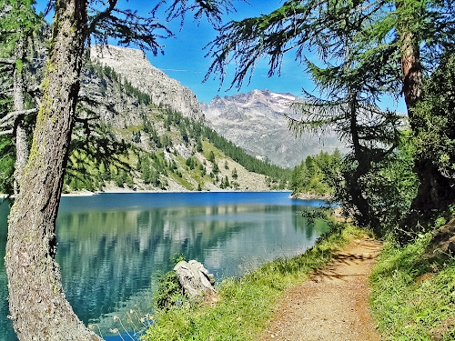 Bellissima, il lago col riflesso,gli alberi, il sentiero, l'erba, le montagne, complimenti.