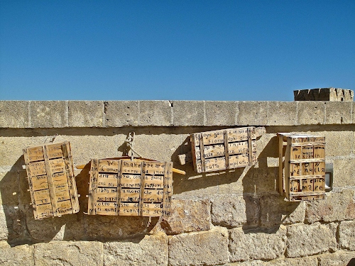 Tag: cassette, muro, legno, cielo, frasi, parole, azzurro, corda, appese, torre, scritte, mattoni, casse, ombre, ombra.