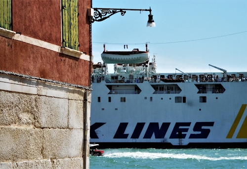 E all'improvviso alla fine di una calle, ho visto questa nave da crociera che procedeva con tutta la sua mole imponente nel canale della Giudecca,nascondendo tutto al suo passaggio.Correva l'anno 2012. Dal 1 agosto 2021,esiste un decreto che vieta il transito nelle vie urbane d'acqua Bacino di San Marco, Canale di San Marco e Canale della Giudecca.