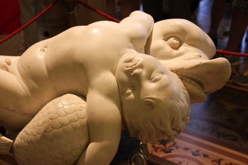 Non è chiaro se il bimbo è morto o solo addormentato (io preferisco questa seconda ipotesi), in ogni caso l'atteggiamento di abbandono, sullo strano delfino squamato, c'è tutto.