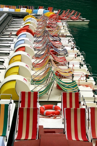 Tanti pedalo in fila durante il periodo di pausa, ripresi con un medio tele che li fa sembrare tutti incollati.