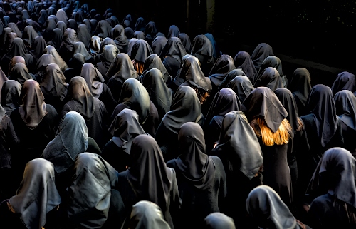 Bellissima! Sapiente gioco di luci e ombre. (E che dire di quel tocco luminoso dei capelli biondi che sembra sfuggire all'atmosfera austera del corteo...)
