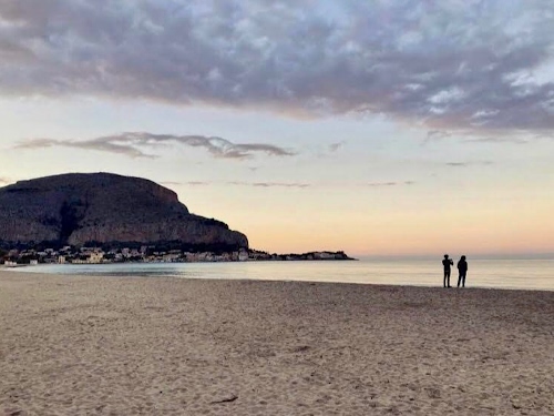 Tag: mare, nuvole, spiaggia, sabbia, cielo, due, persone, promontorio, paese, tramonto, acqua, montagna, case, azzurro, panorama.