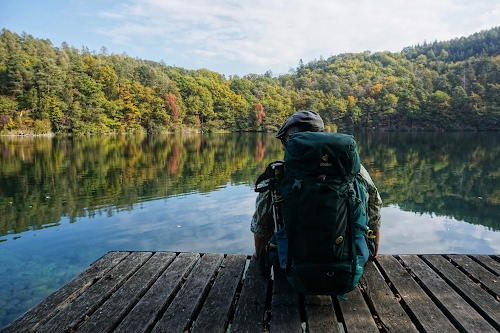 Tag: lago, zaino, alberi, verde, acqua, legno, riflessi, seduto, uomo, azzurro, riflesso, cielo, calma, persona, nuvole, bosco.