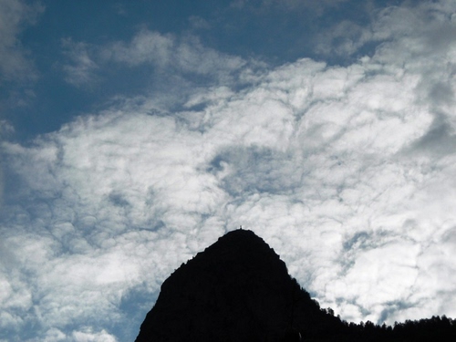 Gruppo nuvoloso che presenta un'areola sopra la statua della Madonna posta in vetta al Monte Chetif (q.2.343).Courmayeur(AO).