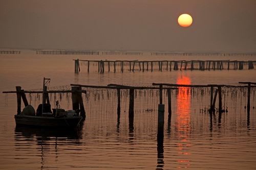 La sensazione è quella di una bell'alba quando il silenzio e la quiete padroneggiano prima che cominci la vita di tutti i giorni. Una barca isolata ormeggiata mi porta a chiedermi se le altre barche siano già partite quando era ancora buio o se il luogo sia ormai quasi abbandonato. Il riflesso del sole e quelli della barca e dei pali non sono particolarmente dominanti, forse avrebbe reso di più una lunga esposizione. Lo scrivo per ultimo ma è quello che mi ha colpito per primo: l'orizzonte sembra fortemente pendere. Dico sembra perché con la foschia sullo sfondo non si capisce se ci sia della terra o se si veda l'orizzonte del mare. Ad ogni modo la percezione è che la foto sia storta, quindi l'avrei raddrizzata perché, secondo me, in questi casi la percezione dell'osservatore prevale sul resto.