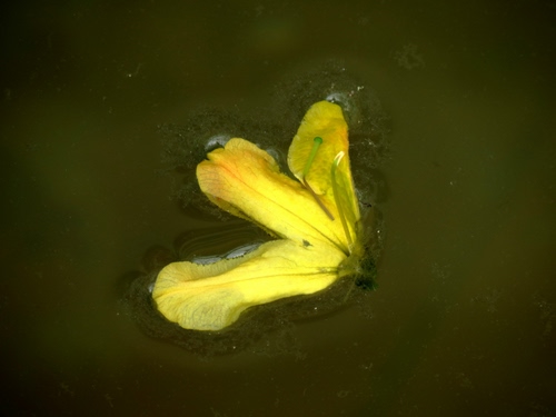 Un fiore sfiorito caduto in una una pozza di acqua stagnante