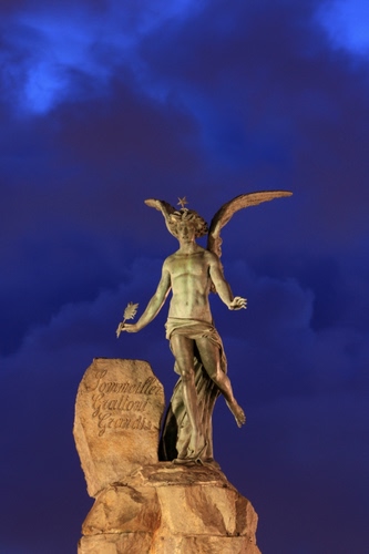 Tag: cielo, statua, ali, nuvole, angelo, blu, monumento, stella, braccia, penna, pietra, scritta, gambe.