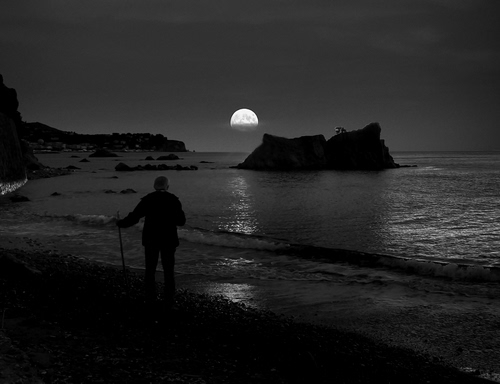Tag: mare, luna, scogli, bianconero, uomo, persona, acqua, spiaggia, riflesso, notturno.