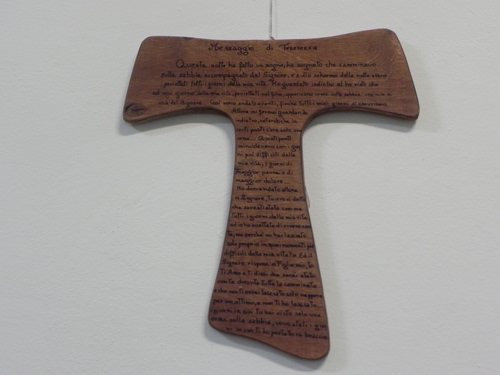 Appesa al muro di una sala, una croce tau, simbolo di San Francesco, con inciso il "messaggio di tenerezza".