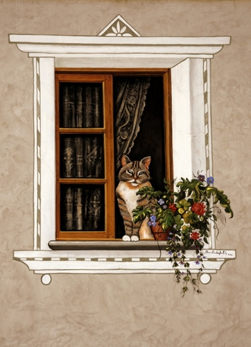 Tag: finestra, gatto, fiori, tenda, murales, dipinto, vaso, pittura.