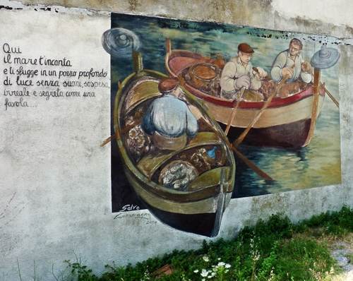 Tag: barche, pescatori, murales, erba, muro, verde, scritta, fiori, disegno, poesia, mare, due, murale, remi, bianco, affresco, dipinto, pesca, lampare.