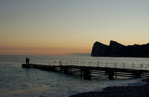 Tag: mare, persone, tramonto, pontile, acqua, controluce, due, molo, cielo.