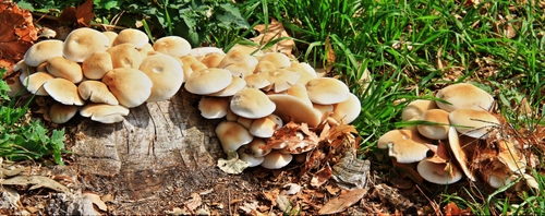 Tag: funghi, erba, tronco, foglie, prato, verde, cappelle, gruppi, giallo, natura, bosco.