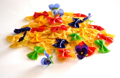 Mi ha colpito in fase di foto, anche senza vedere il titolo - l'idea di colorare la pasta farfalle per renderla colorata come le farfalle è geniale. Ottimo pure mettere i fiori sulle farfalle, mentre nella realtà è il contrario.