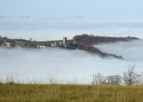 Dal mare di nuvole che coprono la pianura padana spunta Serramazzoni.