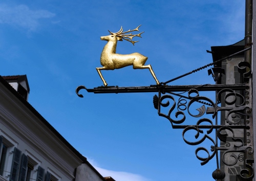 Tag: insegna, cielo, ferro, cervo, oro, azzurro, corna, battuto, metallo, case, animale, riccioli, abbaino, giallo, finestre.