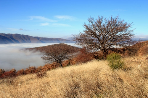 Tag: nebbia, erba, alberi, panorama, albero, nuvole, autunno, montagna, montagne, giallo, monti, sterpaglie.