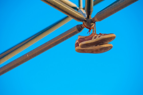 Tag: scarpe, appese, cielo, tubi, azzurro, lacci, acciaio, paio.