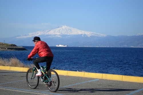 Una passeggiata in bicletta davanti ad un paesaggio suggestivo nella via marina bassa di Reggio c. localià tempietto , scattata a volo mentre ammiravo il paesaggio mi ha colpito il contrasto del colore rosso indossato dal ciclista con con il suo colore complementare blu spezzato dalla striscia gialla della via.