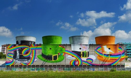 E' un murales enorme fatto a Parco Dora a Torino, cito da Wikipedia: "Il 30 gennaio 2015 è stato inaugurato un murales dedicato a Bobby Sands, in occasione del 25º anniversario della sua morte. Le quattro torri di raffreddamento cilindriche sono state trasformate in quattro simboli dedicate all'attivista irlandese e alla sua patria: un boccale di birra e tre cappelli a cilindro dei colori irlandesi (verde, bianco, arancione). Sotto il boccale di birra compaiono un'arpa e una croce celtica; il cilindro verde è composto di trifogli, usati da San Patrizio per spiegare la Trinità agli irlandesi; quello bianco presenta l'Easter lily, il fiore che gli irlandesi portano a Pasqua in ricordo delle vittime repubblicane della rivolta di Pasqua 1916, che diede il via all'indipendenza dell'Irlanda datata 1922; sul cappello arancione è presente un'allodola, un simbolo della libertà che non si piega davanti alla prigionia. Come unione di questi quattro elementi, c'è un nastro con i colori dell'arcobaleno, simbolo di pace e ricordo di una leggenda irlandese, secondo la quale chi riuscirà a raggiungere l'arcobaleno all'orizzonte troverà alla sua fine una pentola d'oro." |
