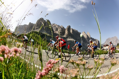 Tag: ciclisti, montagna, fiori, montagne, strada, bicicletta, biciclette, curva, ciclismo, corsa, erba, verde.