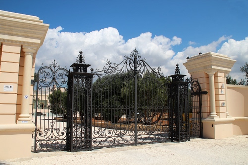 Tag: cancello, colonne, nuvole, alberi, ferro, ingresso, villa, cielo, strada, pilastri, entrata.
