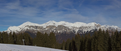 Panorama dalla cima del monte Avena, che sovrasta la città di Feltre in provincia di Belluno. Il massiccio culminante con il Col del Piaz è talmente vasto che ho avuto bisogno di diversi scatti, poi uniti al pc, per riprenderlo tutto (mi manca ancora un obiettivo ultragrandangolare). Immerso nel bianco si può scorgere un rifugio color mattone.