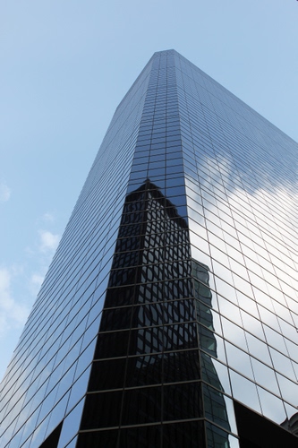 Un grattecielo si riflette sui vetri di un altro grattacielo. A Manhattan, ovviamente.