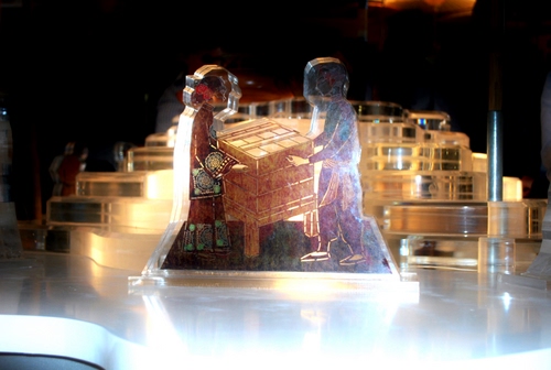 Figure di personaggi cinesi rinchiuse dentro un guscio, che si vedono con una delicata trasparenza.