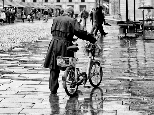 Tag: bicicletta, pioggia, uomo, bianconero, impermeabile, persone, bagnato, passanti, riflesso.