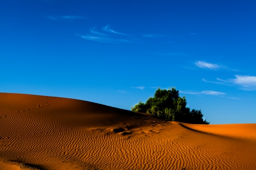 Anche nel deserto sabbioso si incontrano le piante. Rosso della sabbia, celeste del cielo, verde delle piante. Colori netti.