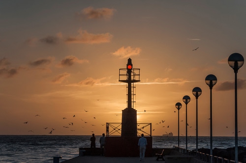 Tag: lampioni, tramonto, mare, faro, fanale, uccelli, controluce, molo.