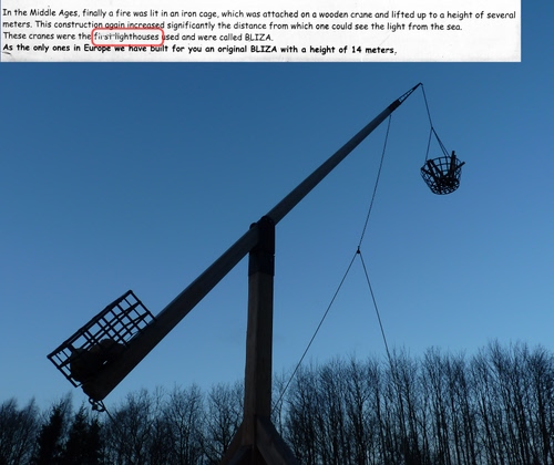 Fotomontaggio fra due foto - della bliza e del pezzo della descrizione in inglese che si trova sotto il manufatto. Parco delle Miniature a Niechorze.