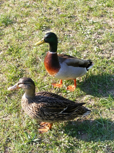 Tag: due, zampe, erba, anatre, papere, piume, uccelli, becco, prato, becchi, animali, verde, femmina, palmipedi, ombre, maschio, colori, pennuti.