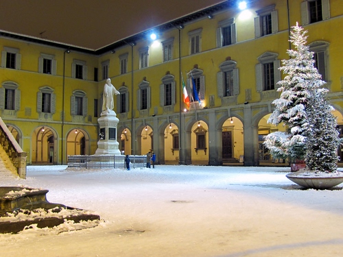 Neve in piazza del comune a Prato con l'albero e bambini che si divertono sotto la statua del Datini.